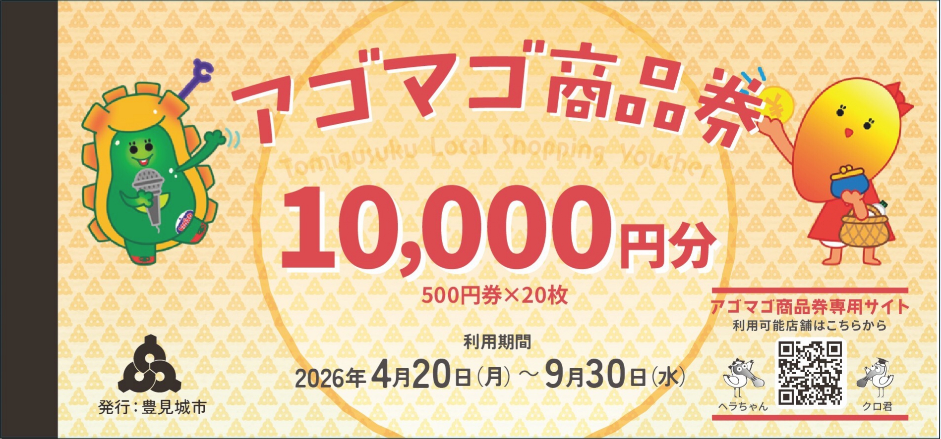支給対象者:令和8年1月1日時点で、豊見城市に住民票を有する市民へ500円×20枚(計10,000円分)の商品券をを各世帯主に配布いたします。