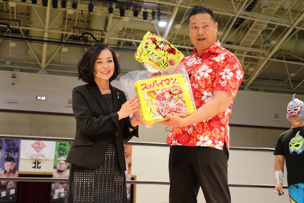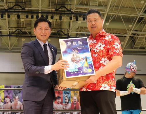 九州プロレス様へ開催の御礼として、本市より「スッパイマンプロテイン」と「梅キャンディー」、忠孝酒造株式会社様より「泡盛 夢航海」を贈呈しました。