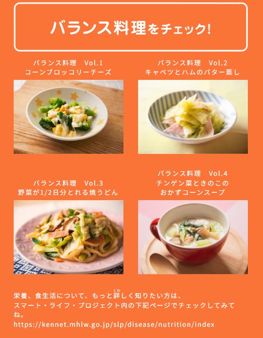 厚生労働省ホームページでは、簡単に美味しく作れる野菜料理の紹介があります。
