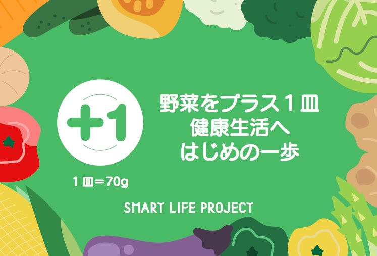 歩数の目標量は、1日に8000歩です。(65歳以上は6000歩) - プラス1皿の野菜…平均して、1日に小鉢1皿分の野菜(70グラム)が不足しているといわれています。