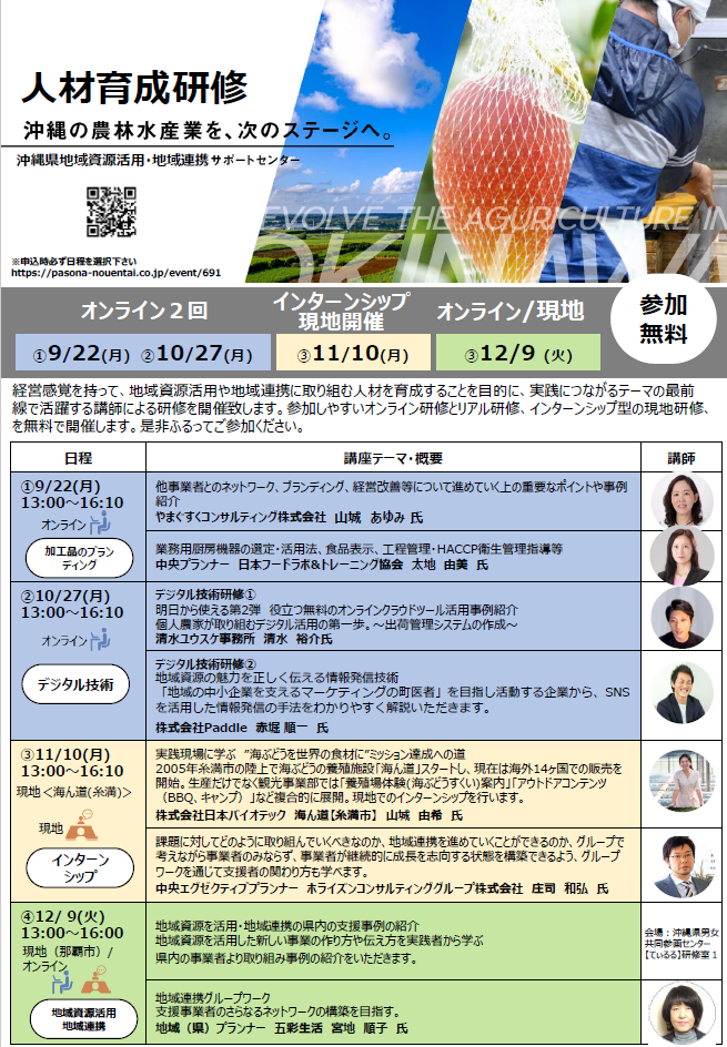経営感覚を持って、地域資源活用や地域連携に取り組む人材を育成することを目的に、実践につながるテーマの最前線で活躍する講師による研修を開催します。参加しやすいオンライン研修とリアル研修、インターンシップ型の現地研修を無料で開催します。