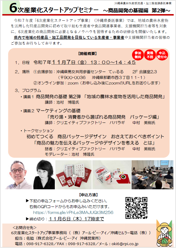 令和7年度「6次産業化スタートアップ事業」(沖縄県委託事業)では、地域の農林水産物を活用した特産品開発に初めて取り組む生産者や食品関連事業者、支援機関担当者等を対象に、6次産業化の商品開発に必要となるノウハウを習得するための研修会を開催いたします。県内で地域の特産品・加工品開発を目指している生産者・事業者や支援機関担当者の皆様のご参加をお待ちしております。