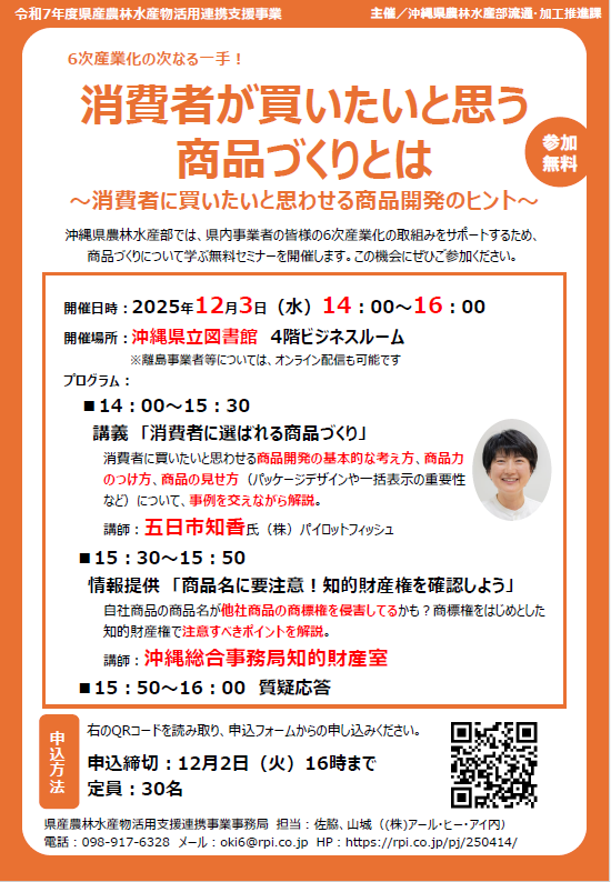 県内事業者の皆様の6次産業化の取組みをサポートするため、商品づくりについて学ぶ無料セミナーを開催します。この機会にぜひ参加ください。